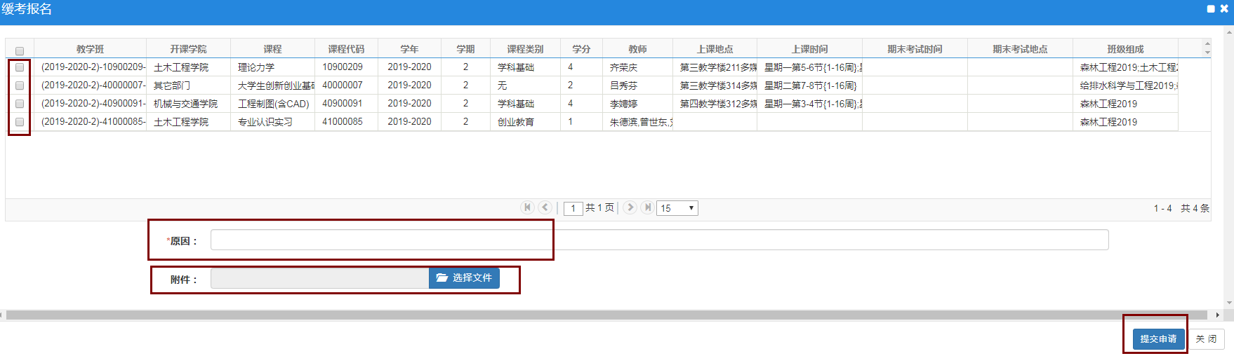 缓考的课程选定之后,在下面“原因”处说明原因,如果有相关附件,上传附件,然后点右下角“提交申请”。