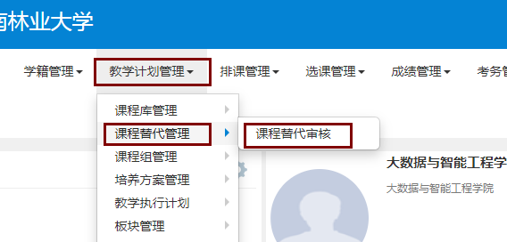 2、进入之后,在“教学计划管理”——“课程替代管理”——“课程替代审核”中进行审核。