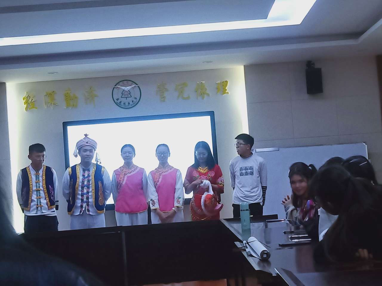 班级同学分别来自汉族、维吾尔族、白族、苗族、回族、壮族、彝族和哈尼族八个民族,每个民族代表同学都从民族语言、文字、习俗、节日、美景、美食等方面进行民族文化分享。从回族开斋节到彝族火把节,从汉族江南地区的东坡肉到新疆维吾尔族的烤羊肉串,从绚烂多彩的维吾尔族艾德莱斯绸到浪漫优雅的白族“风花雪月”,同学们身着民族特色服饰各显其长,用朗诵、歌曲、舞蹈、书画、音乐与视频等丰富多样的形式,为全体师生带来了一场民族文化视听盛宴。会间,胡晓老师与各民族代表同学亲切交流,班会气氛朝气蓬勃、其乐融融。