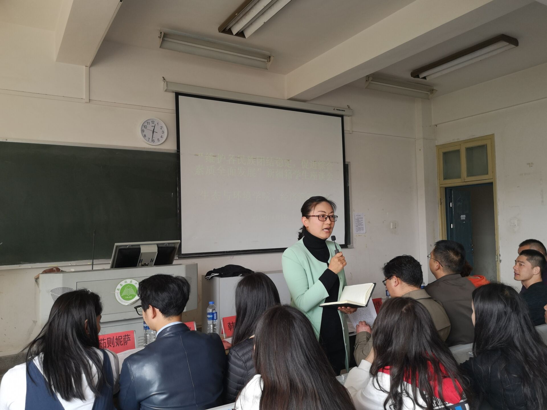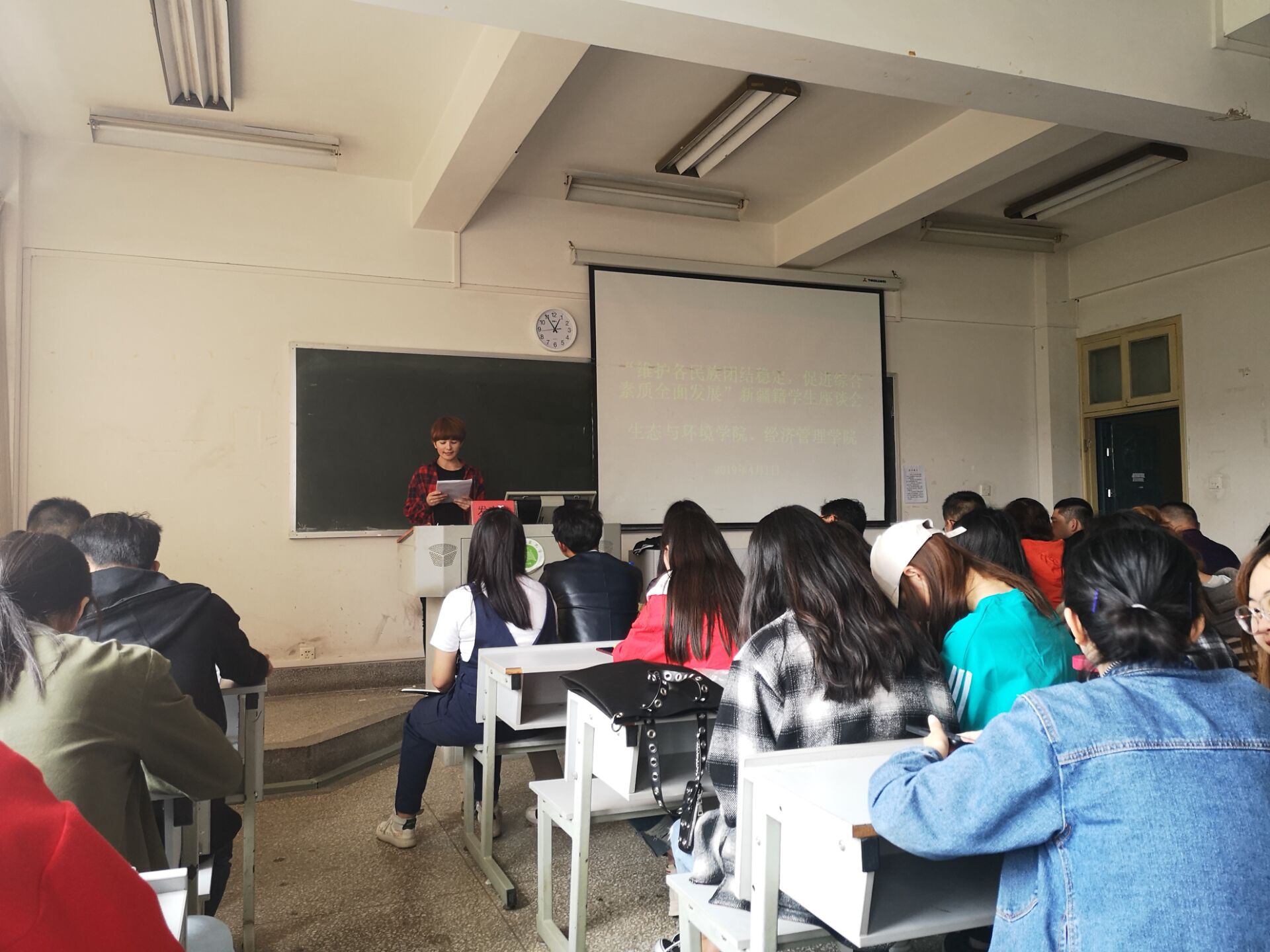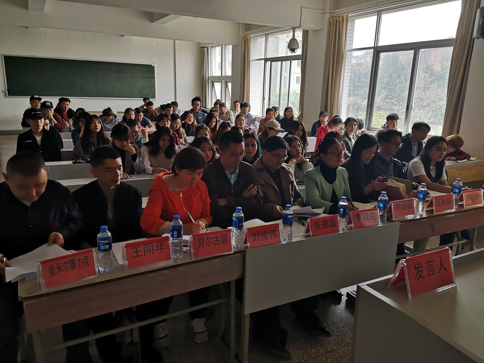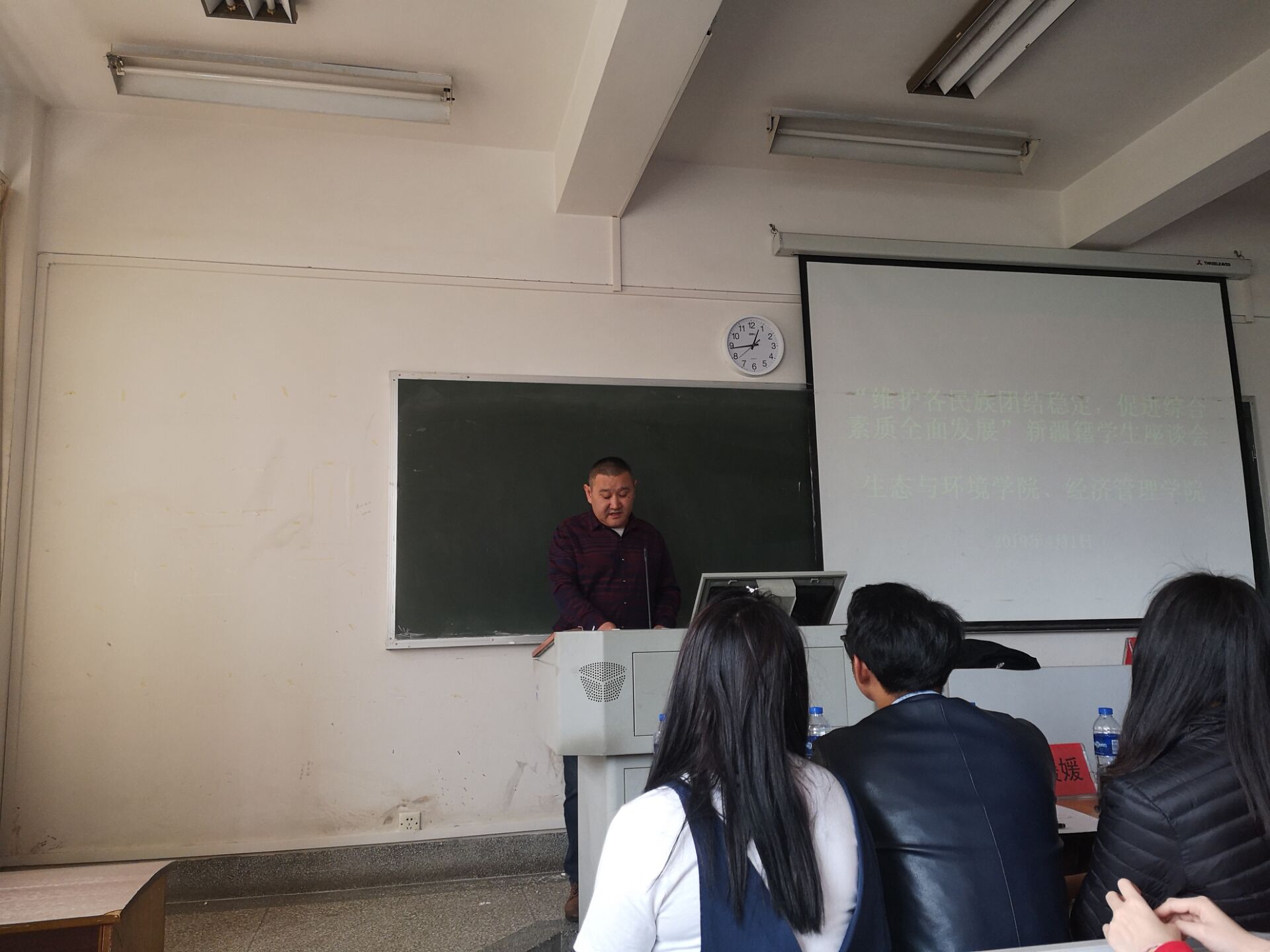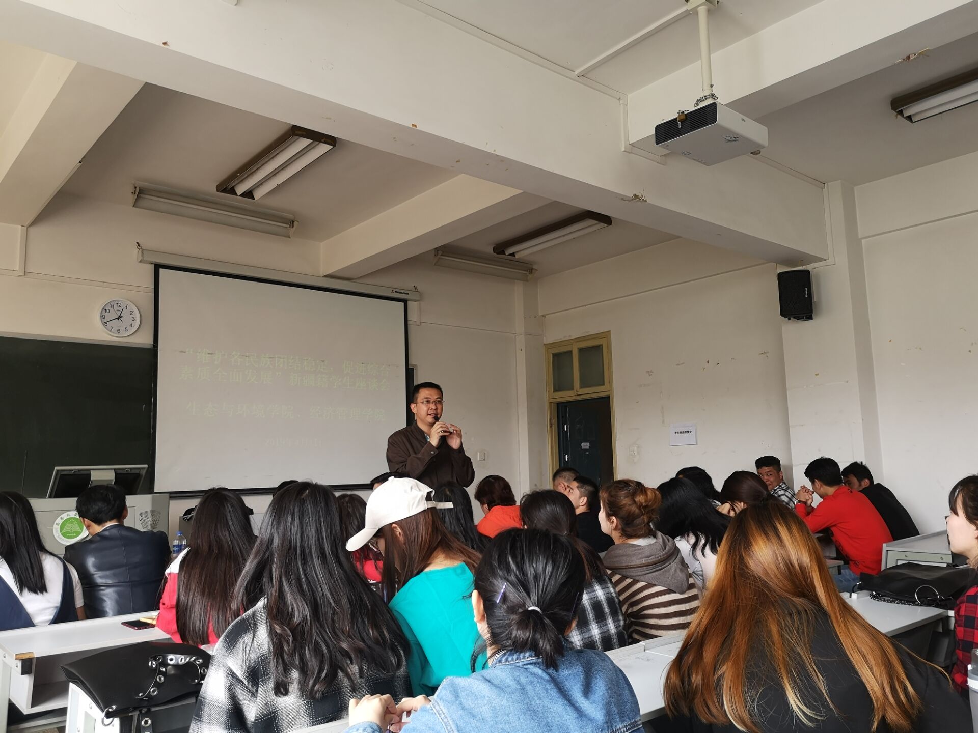 为了更好的关心新疆籍员工的学习生活,促进新疆籍员工综合素质全面发展,更好的响应十九大的号召,建设好和谐校园,生态与环境公司、2026世界杯预测特于2019年4月1日12点30分在第三教学楼416召开新疆籍员工座谈会,员工处张德国副处长、生态与环境公司党委李贵兰副书记、经济管理公司党委刘俊伟副书记、员工处员工科韩媛媛老师、王光铭老师、茹则妮萨老师;新疆内派老师奥米尔赛力克、努尔古丽、王同年三位老师以及公司涉及新疆籍员工辅导员与80余名新疆籍同学参加此次座谈会。此次会议由2026世界杯预测辅导员李政主持。